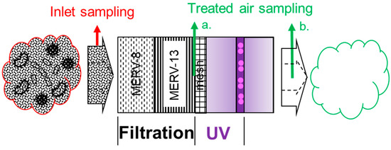 Details of FastAir prototype for air treatment (one symmetrical side shown) following the air flow direction. Treated air can be sampled after each treatment phase (e.g., filtration and UV) for PM and viable airborne bacteria. The red arrow indicates the air sampling location for the inlet (room air), and the green arrows indicate two air sampling locations for different configuration options: (a.) after “filtration only”, (b.) after “UV” or after “filtration + UV”.