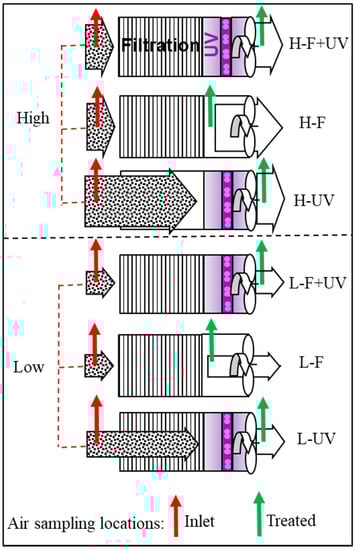 Six configuration options were commissioned to test the FastAir prototype under high and low flow rate modes. They are denoted with the following acronyms (in parenthesis) for convenience: high mode, filtration + UV (H-F + UV); high mode, filtration only (H-F); high mode, UV only (H-UV); low mode, filtration + UV (L-F + UV); low mode, filtration only (L-F); low mode, UV only (L-UV).