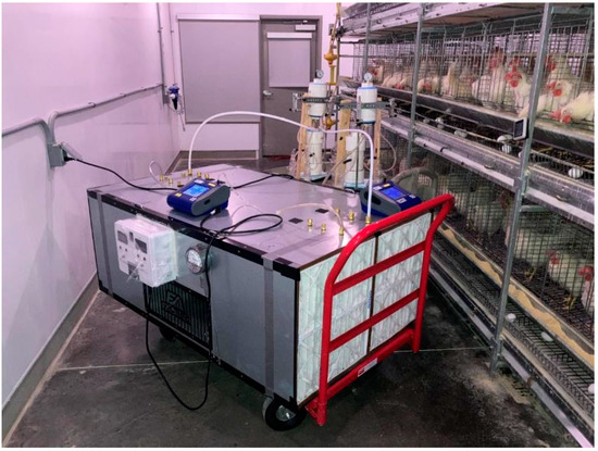The FastAir prototype was first tested in a laboratory room for air cleaning effects. However, due to the modern air cleaning equipment available in the building, the air in the laboratory was very clean (i.e., TSP concentrations were less than 10 µg/m3, and viable airborne bacteria were hardly recovered with SKC BioSamplers®), so the treatment effect could not be substantiated. A summary of the preliminary testing results is included in Tables S2 and S3 in the Supplementary Material. Considering this, we chose one of the poultry rooms at the Robert T. Hamilton Poultry Teaching & Research Farm as the testing site because the indoor air environment is dusty and contains a sufficient level of viable airborne bacteria; therefore, the treatment effect could be easily observed and quantified. The room selected for testing was 11.9 × 4.9 × 4.3 m (L × W × H), equipped with mechanical ventilation and a direct gas-fired circulating heater, and housed about 150 laying hens in conventional cages (Figure S11). During the experiment, the poultry room temperature ranged from 20.0 °C to 23.3 °C, and relative humidity (RH) ranged from 20% to 45%.