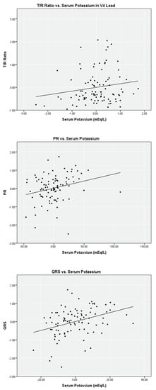 In addition, ROC analyses were generated with calculated sensitivities, specificities, and positive and negative predictive values using cutoff thresholds of 0.75 for T-wave to R-wave ratio, 200 ms for PR interval, and 120 ms for QRS duration, where hyperkalemia was defined as [K+] ≥ 5.3 mEq/L. Optimal cutoff points were also calculated using the Youden Index. Outliers were removed based on Z-scores greater than 3 or less than −3. Due to the removal of outliers, certain analyses had different sample sizes. All analyses were performed using Microsoft Excel 2013 for Windows, version 15.0.5007.1000, MedCalc for Windows, version 18.0 (MedCalc Software, Ostend, Belgium), and SPSS (IBM Corp. Released 2013. IBM SPSS Statistics for Windows, Version 22.0. Armonk, NY, USA: IBM Corp).