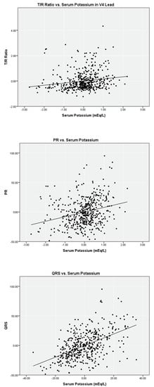 Linear regression analysis on the limited data set for serum potassium versus T/R in V2, V3, and V4, PR, and QRS found weak correlations (r2 = 0.02 to 0.12) with a statistical significance < 0.05 level for T/R in V2, V3, and V4 (Table 2). Scatter plots with fitted lines of T/R ratio in the V4 lead, PR, and QRS are shown in Figure 1. Similar analyses were performed with the complete data set. Regression analysis for T/R in V2, V3, and V4, PR, and QRS versus serum potassium also yielded weak correlation, and the scatter plots are shown in Figure 2.