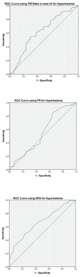 Furthermore, ROC analysis of the T/R ratio in V2, V3, and V4, PR interval, and QRS duration suggested a fair diagnostic performance in all the parameters but PR interval, with fair sensitivity and specificity. Using optimal cutoff thresholds based off the Youden Index for each of the ECG characteristics, we found a significant tradeoff between sensitivity and specificity. Although the diagnostic performances of the ECG parameters were statistically significant, due to the poor sensitivity and specificity, the clinical utility of these parameters was poor. However, it is plausible that a computer model utilizing multiple parameters simultaneously could predict hyperkalemia more reliably, as noted by Attia et al. [40].