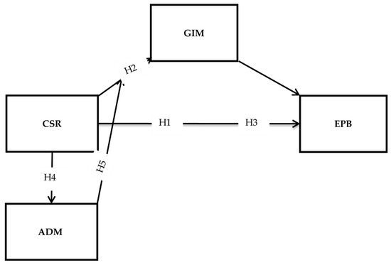 We report the hypothesized framework of this study in Figure 1. This includes four main variables (excluding the interaction term), CSR, EPB, GIM, and ADM. CSR is the main predictor, and EPB is the criterion. GIM has been included in this model as a mediator, and ADM joins as a moderator.