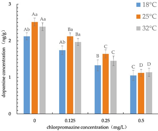 Dopamine concentration of rotifers at different chlorpromazine concentrations and temperatures. Values in each column with different capital letters indicate significant differences among treatments for each temperature (p < 0.05); column values with different small letters indicate significant differences among treatments for each chlorpromazine hydrochloride concentration (p < 0.05).