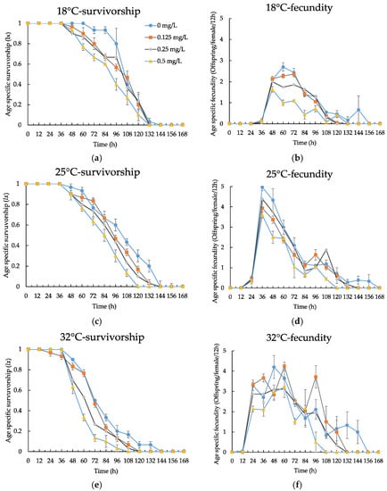 Age-specific survivorship and age-specific fecundity of B. calyciflorus exposed to different concentrations of chlorpromazine at different temperatures. Shown are the mean ± standard error based on three replicates for: (a) 18 °C—survivorship; (b) 18 °C—fecundity; (c) 25 °C—survivorship; (d) 25 °C—fecundity; (e) 32 °C—survivorship; (f) 32 °C—fecundity.