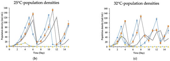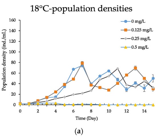 Population growth curves expressed by population densities of the B. calyciflorus exposed to chlorpromazine cultured at 18, 25 and 32 °C. Shown are the mean ± standard error based on three replicates for: (a) 18 °C—population densities; (b) 25 °C—population densities; (c) 32 °C—population densities.