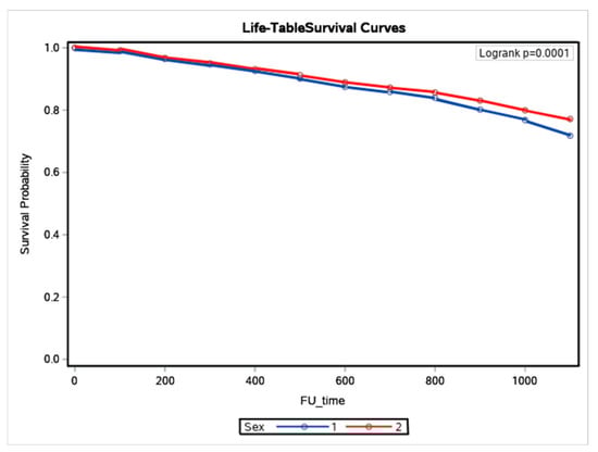Kaplan–Meier survival curves in women and men with heart failure (Sex 1 means men and 2 women).