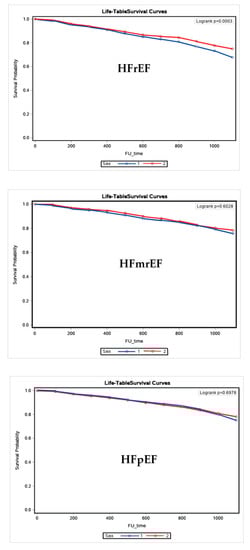 Table 3 shows the clinical characteristics and echocardiographic data of women and men with HF with preserved (HFpEF), mid-range (HFmrEF), and reduced (HFrEF) left ventricular ejection fraction.