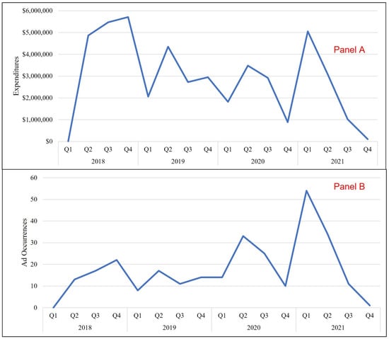 | Proportion of Unique Ads (n = 30) | Percentage of Total Occurrences (n = 284) | Expenditures | Percentage of Total Expenditures | |