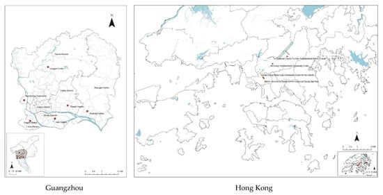 Focusing on conspicuous high-rise public housing, we selected housing cases by purposive sampling in the two cities, making sure their location and population size were comparable, as shown in Figure 2. For the HK survey, questionnaires were collected by arranging meetings with members of four community centres for older residents located near public housing estates in two districts—Sham Shui Po and Shatin, representing two typical urban forms of the older urban centres and new town in HK, respectively [61]. These community centres are places that older adults visit daily. We also interviewed adult residents in public parks near to these locations and completed the questionnaire with them on site, in order to involve both younger and older adults. In total, 459 valid questionnaires were collected in HK between July 2017 and December 2017.