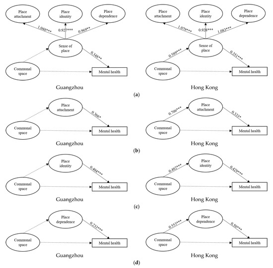 Pathways of model 5–8. (a) Model 5: Pathways of communal space linking sense of place and mental health in HK; (b) Model 6: Pathways of communal space linking place attachment and mental health in HK; (c) Model 7: Pathways of communal space linking place identity and mental health in HK; (d) Model 8: Pathways of communal space linking place dependence and mental health in HK. *** p < 0.001, ** p < 0.01, * p < 0.05; the solid line is the significant path, but the dotted line is not.