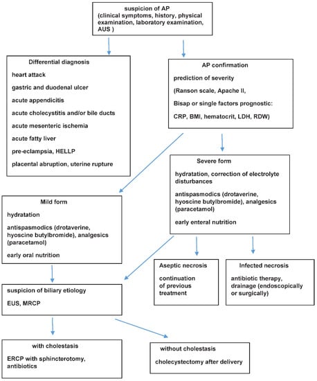 The performance of endoscopic retrograde cholangiopancreatography (ERCP) in pregnancy is controversial. The indication for ERCP in pregnancy is symptomatic cholelithiasis manifested by jaundice, cholangitis, or biliary pancreatitis. Recent data, although limited by the lack of information on trimester, suggest that early intervention (ERCP or cholecystectomy) is preferable to no treatment [,]. Still, many researchers support the notion that, in most cases, the introduction of one or more plastic bile stents for biliary decompression during ERCP without fluoroscopy prevents biliary obstruction. Definitive therapy should be performed after childbirth []. ERCP with fluoroscopy carries a risk of teratogenic radiation to the fetus and an increased risk of future malignancies in the baby. It is safest to perform ERCP without radiation exposure during the third trimester of pregnancy. Due to the high risk for the fetus, ERCP in pregnancy should be considered in a reference center with a team with extensive experience and in performing tests without the use of fluoroscopy, possibly with choledochoscopy. The preterm delivery of pregnancy should be considered in the case of a worsening clinical condition of the mother despite 24–48 h intensive treatment, paralytic ileus, imminent miscarriage, intrauterine fetal death, fetal defects, and severe course of AP [].