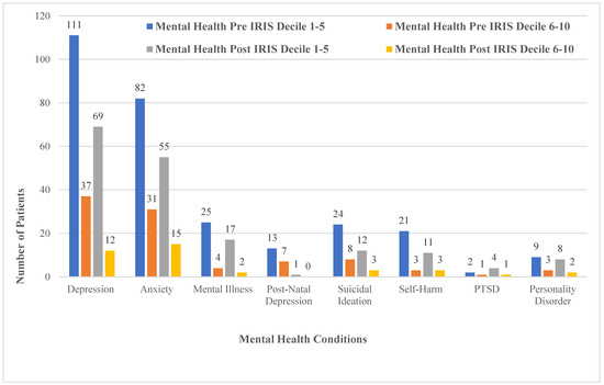 Figure 4 compares recorded mental health conditions and deprivation decile. Pre-IRIS in decile 1–5 (the most deprived areas), 44% (n = 111) of the sample had depression recorded, and 33% (n = 82) had anxiety recorded. Post-IRIS in deciles 1–5, depression and anxiety which were recorded at 28% (n = 69) and 22% (n = 55), respectively. Figure 4 also illustrates the health conditions mapped with deciles 6–10, the least deprived areas. Pre-IRIS, 15% (n = 37) of the sample had depression recorded and 12% (n = 31) had anxiety recorded. Post-IRIS in deciles 6–10, depression and anxiety were recorded at 5% (n = 12) and 6% (n = 15), respectively. Suicidal ideation was recorded at 13% pre-IRIS, with a drop to 6% post-IRIS, and when mapped for decile 1–5, pre-IRIS was recorded at 10%, dropping to 5% post-IRIS. Similarly, in deciles 6–10, 3% recorded pre-IRIS and 1% recorded post-IRIS.