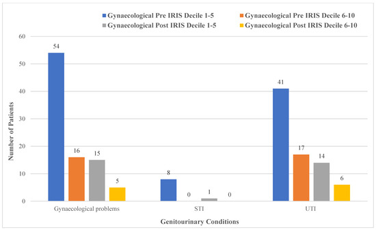 Figure 5 shows the genitourinary health conditions of the 250 patients related to deprivation decile. The health data were mapped according to decile information, and all indicated a decrease post-IRIS intervention. Pre-IRIS in deciles 1–5, 22% (n = 54) of the sample had recorded the broader gynaecological conditions, 3% (n = 8) was recorded for STIs and 16% (n = 41) recorded for UTIs. Pre-IRIS in deciles 6–10, 6% (n = 16) had gynaecological conditions, 0% had STIs and 7% had UTIs recorded. Post-IRIS in deciles 1–5 gynaecological conditions, STIs and UTIs were recorded at 6% (n = 15), 0.4% (n = 1) and 6% (n = 14), respectively. Post-IRIS 6–10, gynaecological conditions, STIs and UTIs were recorded at 2% (n = 5), 0% and 2% (n = 6), respectively.