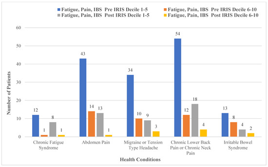 Figure 6 illustrates the health conditions associated with pain, fatigue and irritable bowel syndrome (IBS). The health data were mapped according to decile information of the 250 patients, and all dropped post-IRIS intervention. Although Figure 6 outlines specific health conditions associated with pain, these conditions are portrayed collectively as pain in the following recorded data. Pre-IRIS in deciles 1–5, 52% (n = 131) of the sample had recorded pain, 5% (n = 12) for recorded for chronic fatigue and 5% (n = 13) recorded for IBS. Pre-IRIS in deciles 6–10, 14% (n = 36) had pain recorded, 0.4% (n = 1) chronic fatigue and 3% (n = 8) had IBS recorded. Post-IRIS in deciles 1–5, pain, chronic fatigue and IBS were recorded at 16% (n = 40), 3% (n = 4) and 2% (n = 4), respectively. Post-IRIS in deciles 6–10, pain, chronic fatigue and IBS were recorded at 3% (n = 8), 0.4% (n = 1) and 1% (n = 2), respectively.