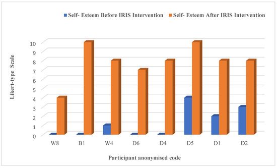 In most of the interviews (where it seemed appropriate), the participants were asked to assess their sense of self-esteem before and after IRIS and score it based on a Likert-style scale, with 0 relating to extremely poor and 10 being extremely high. Figure 7 reflects some of their responses to this qualitative self-rating.