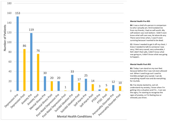 Figure 3 shows the presence of health conditions before and after IRIS support as reported in GP records of 268 patients (26 patients excluded from this part of the analysis due to incomplete health data). This overall profile of aggregated results indicates that there was a difference in all health conditions before and after receiving IRIS support. Depression, anxiety, mental illness, post-natal depression, suicidal ideation and self-harm all show decline after IRIS intervention. As indicated in the results, pre-IRIS, 57% (n = 153) of the sample had depression recorded and 44% (n = 119) had anxiety recorded. Post-IRIS, depression and anxiety were recorded at 32% (n = 86) and 28% (n = 76), respectively, indicating decline.