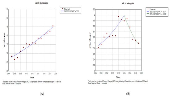 The caesarean section rate increased from 2005 to 2019 at 3.5% per annum (AAPC: 3.5%, 95%CI: 3.0% to 4.0%) in CHBAH (Figure 1A and Figure 2A, Table 1, Supplementary Table S2). Although the caesarean section rate was generally higher at CMJAH from 2009–2019, the overall trends was not a significant increase (4.1% per annum [AAPC: 4.1, 95%CI: −10.7 to 2.9, p-value = 0.2]). Joinpoint regression identified 3 trends of caesarean section rates at CMJAH as shown on Figure 1A and Figure 3A.