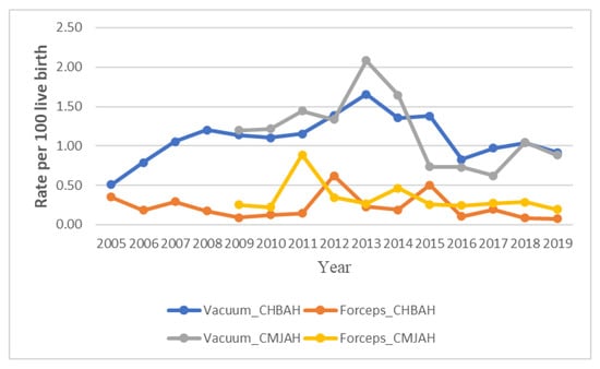 The Vacuum delivery rates was generally higher at CMJAH as comapared to CHBAH from 2009–2014, and the rates became slightly higher at CHBAH from 2015–2019.