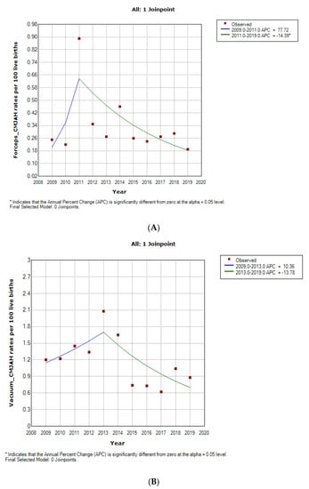 Join point regression analysis of the trends in Forceps deliveries (A) and Vacuum (B) rates at Charlotte Maxeke Johannesburg Academic Hospital, 2009–2019.