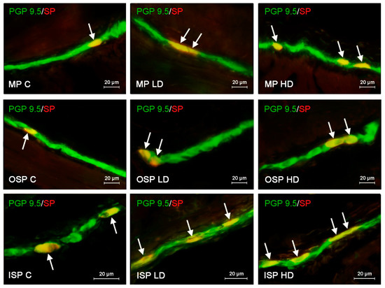 Distribution pattern of nerve cells immunoreactive to protein gene-product 9.5 (PGP 9.5)–used as pan neuronal marker and substance P (SP) in the myenteric plexus (MP), outer submucous plexus (OSP) and inner submucous plexus (ISP) of porcine descending colon under physiological conditions (C) and after administration of small dose (LD) and high dose (HD) of bisphenol A. The pictures are the result of the overlap of both stainings. The arrows point neurons immunoreactive for both–PGP 9.5 and SP.
