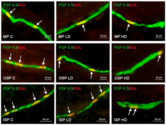 Distribution pattern of nerve cells immunoreactive to protein gene-product 9.5 (PGP 9.5)–used as pan neuronal marker and galanin (GAL) in the myenteric plexus (MP), outer submucous plexus (OSP) and inner submucous plexus (ISP) of porcine descending colon under physiological conditions (C) and after administration of small dose (LD) and high dose (HD) of bisphenol A. The pictures are the result of the overlap of both stainings. The arrows point neurons immunoreactive for both–PGP 9.5 and GAL.