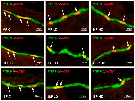 Distribution pattern of nerve cells immunoreactive to protein gene-product 9.5 (PGP 9.5)–used as pan neuronal marker and vesicular acetylocholine transporter (VAChT) in the myenteric plexus (MP), outer submucous plexus (OSP) and inner submucous plexus (ISP) of porcine descending colon under physiological conditions (C) and after administration of small dose (LD) and high dose (HD) of bisphenol A. The pictures are the result of the overlap of both stainings. The arrows point neurons immunoreactive for both–PGP 9.5 and VAChT.