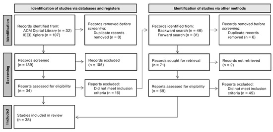 A backward search [25] was conducted, where the most relevant citations from the included studies were scanned through, and 46 records were found. From those, 33 did not meet the inclusion criteria and 5 duplicate were excluded. A forward search [25] was also performed, using Web of Science, to ensure all relevant studies were included into the final eligibility round of this review, and 12 more studies (out of 31) were added to the review. At the end, a total of 38 studies were included in this review. Figure 1 illustrates the detailed PRISMA [23] flow diagram used to describe the final search process.