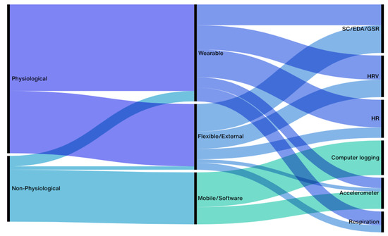 As exhibited in Figure 2, physiological measurements of stress-related data were used more frequently than non-physical ones to monitor workers’ mental states, as they allow researchers to detect emotional arousal and collect ground truth information that can be compared against self-reported data retrieved from surveys and questionnaires.