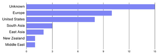 Similarly, as demonstrated in Figure 3, 15 of the 37 included studies that used or collected data from participants to either train Machine Learning (ML) models or deliver stress-mitigating interventions to workers failed to provide a detailed description of the sample from which data were collected. From the retrieved studies that accurately described their sample, 45% used data collected from European countries [26,29,32,35,36,37,41,43,51,57], of which half either reported the development of or employed the SWELL Knowledge Work dataset (SWELL-KW) to train ML models [26,29,32,41,43]. However, according to a 2022 global survey from GALLUP [7], employees from Europe tend to experience less negative emotions (such as worry and stress) than those from the United States or East Asian countries, for example. This infers that ML models trained with datasets from other locations or results reported from a single geographical location may not be replicable or representative of the global population.