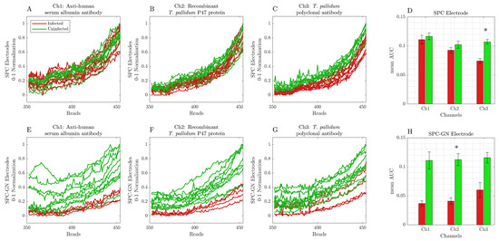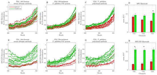 Cyclic voltammetry data were obtained from readings 15 min (T15′) after incubating infected and uninfected samples in SPC or SPC-GN electrodes. Each sample was submitted for 454 readings for each channel, with an interval of 9.25 ms. (A) anti-human serum albumin (Ch1) in SPC electrodes; (B) recombinant T. pallidum p47 protein (Ch2) in SPC electrodes; (C) T. pallidum polyclonal antibody (Ch3) in SPC electrodes; (D) AUC data of infected and uninfected samples using SPC electrodes; (E) anti-human serum albumin (Ch1) in SPC-GN electrodes; (F) recombinant T. pallidum p47 protein (Ch2) in SPC-GN electrodes; (G) T. pallidum polyclonal antibody (Ch3) in SPC-GN electrodes; (H) AUC data of infected and uninfected samples using SPC-GN electrodes. The * indicates the differences that resulted statistically significant for the Mann–Whitney U test after Bonferroni correction (at significance level of α = 0.05).