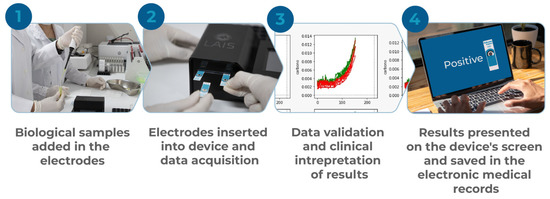 Graphic summary of the procedure from the input of biological samples to the data processing and presentation of results on the device’s screen and its registration in the electronic medical record.
