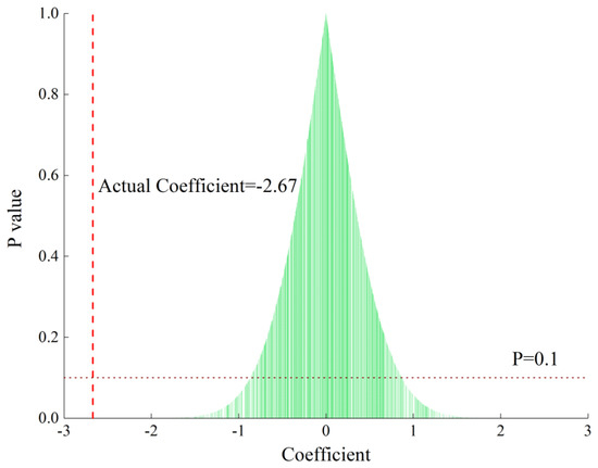 Our concern with the DID model framework is that other potential changes could drive the PM2.5 concentration. We created a placebo test by randomly selecting a sample from the treatment group. We then estimated a regression that included city and year-fixed effects. We repeated the exercise 1000 times and obtained the coefficients of the impact of the carbon trading policy on PM2.5. Figure 2 shows the estimates of the placebo test, and the dashed vertical line represents the actual coefficient obtained by using the actual treatment samples. We find that the true coefficient is far from the random regression results. The falsification exercise suggests that other potential changes did not drive our results.