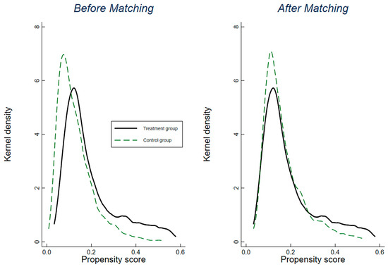 Before using the matched samples, we employed a balance test to evaluate the appropriateness of the treatment and control groups. Three approaches were used. The first measures the deviation of the normalized means for the covariates in the treatment and control groups. Figure S1 (Supplementary Materials) shows the standardized bias across covariates between the matched and unmatched observations. We found that the standardized bias of all covariates was less than 10% and negligible in the matched sample, suggesting that the matching process was effective. We then compared the common support to ensure sufficient overlap in the characteristics of the treatment and untreated units. The results in Figure S2 (Supplementary Materials) show that most of the observations in the treatment and untreated groups fall in the area of common support. Furthermore, we plotted a kernel density figure to test the differences between the matched treatment and control groups. The results suggest that the curve of the treatment group becomes close to the control group after matching (Figure 3). In conclusion, all three methods implied that the treatment and control groups were appropriately matched.