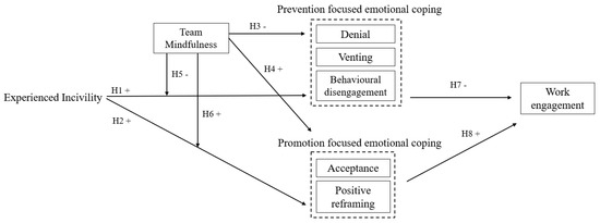 Although many forms of emotion-focused coping can be differentiated, we sought to investigate how incivility and team mindfulness were linked to promotion and prevention-based forms of emotional coping [18]. Promotion-focused coping involves “efforts that maximize the chances for a match between one’s current situation and one’s hopes and aspirations” [18] (p. 1297), and such strategies (e.g., acceptance, positive reframing) serve the goal of obtaining positive outcomes and an ideal state. In contrast, prevention-focused coping is defined as “efforts that minimize the chances for a mismatch between one’s current situation and one’s duties and obligations” [18] (p. 1297). Examples include venting, denial, and behavioral disengagement, which serve the strategy of preventing negative outcomes and failures. Since previous research finds that emotion-focused forms of coping are likely to be adopted more often that problem-focused forms of coping [16], we hypothesized that incivility would be positively associated with both promotion-focused and prevention-focused emotional coping: