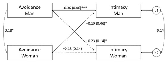 As expected, attachment-related avoidance predicted lower intimacy (H1), but the actor effect was only found in men (Figure 2). A partner’s attachment-related avoidance also predicted lower intimacy in both sexes (H2). There were no significant differences between actor effects (z = 0.33; p = 0.74, 95% CI [−0.25, 0.35]) and partner effects (z = −1.70; p = 0.09, 95% CI [−0.56, 0.04]), which indicated the same pattern in both genders. The difference in intercepts was 2.36 (z = 0.88; p = 0.004, 95% CI [0.75; 3.97]); in the context of predictors, the intraclass correlation between intimacy results for both spouses was 0.14 (p = 0.097, [−0.01, 0.12]); therefore, if one partner obtained a high/low score on the intimacy scale as a result of her/his own and the spouse’s attachment-related avoidance, then the other partner also presented a high/low score on the intimacy scale. Model 1 was a saturated model (i.e., df = 0).