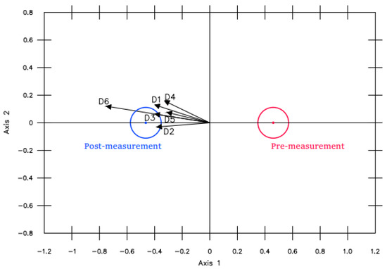 Impact of the BE program on the SC, initial measurement vs. final measurement. The MANOVA Biplot shown in Figure 2 reveals significant differences between the SC pre- and post-measurements. As can be seen, all the dimensions examined presented this difference, the post-measurements being higher than the pre-measurements.