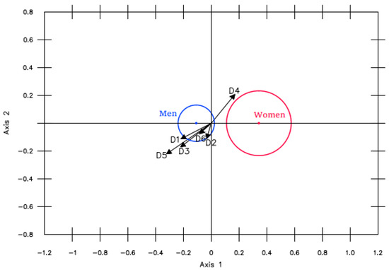 Gender. Likewise, in general, significant differences were observed between the men and women (Figure 3). On the whole, the men presented higher values than the women, except for dimension 4 (Problem-solving), where the women scored higher. Nevertheless, after projecting the groups, these differences were only found to be significant at the 95% level in variables 1 (Physical appearance) and 5 (Relationships with the same sex).
