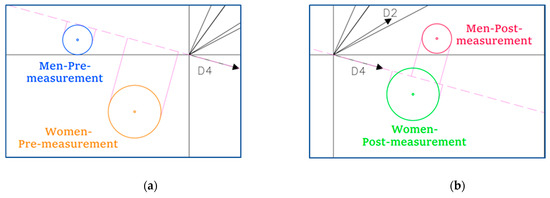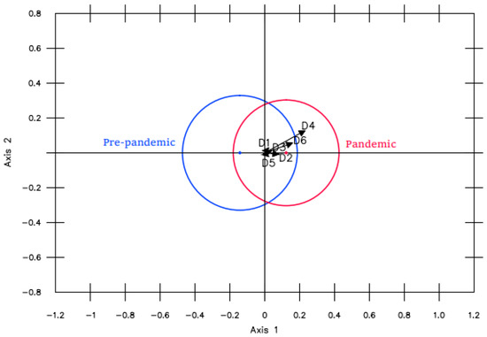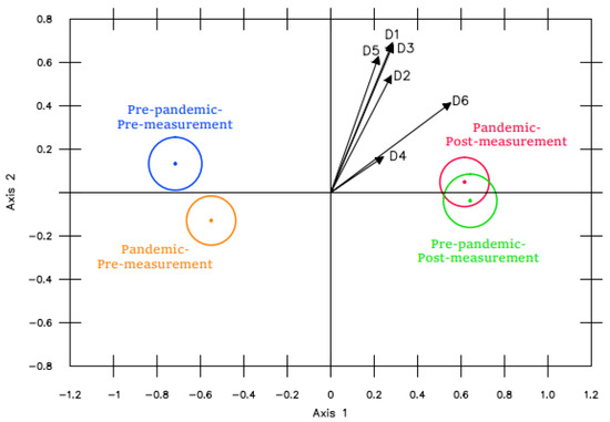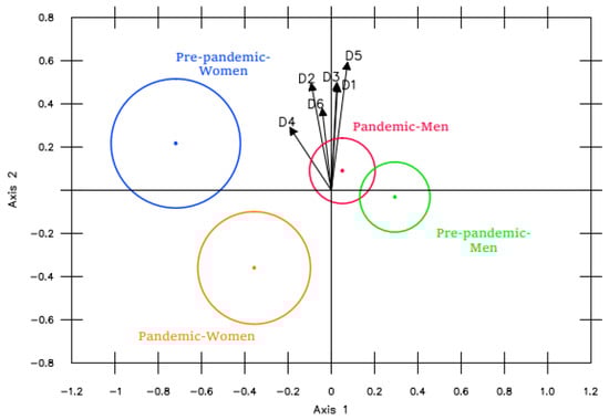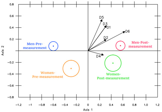 A MANOVA Biplot [51], also known as a canonical biplot [52], was used for data analysis. This technique was designed in order to graphically represent the results of multivariate variance analysis in a reduced space. In this analysis, the dependent variables played the role of continuous variables, while the groups were the regression variables. MultBiplot software (Version 03/12/2018 (18.0312)) [53] was used. One-way and two-way analyses were applied in this study, depending on the SC pre- and post-measurement values, gender and the presence or not of the COVID-19 pandemic.