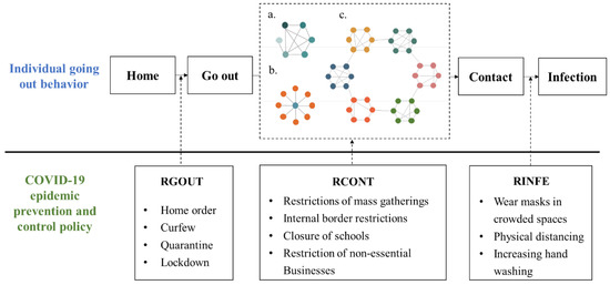 From the perspective of individuals going out, we have divided various nonpharmaceutical prevention and control policies into three types. The three types of policies play certain restrictive roles in different links. The first type is the policy of restricting going out (RGOUT), which affects individuals’ decisions on whether to go out or not, with the purpose of reducing unnecessary times of going out, such as a stay-at-home order and lockdown. The second type is the policy of restricting contact (RCONT), which acts on individuals after they go out and aims to reduce large-scale gatherings and minimize unnecessary contact, such as restrictions of mass gatherings. The third type is the policy of restricting infection (RINFE) when individuals go to crowded places. The purpose is to reduce the infection rate as much as possible through measures such as maintaining physical distance, reducing face touching, and wearing masks in crowded or enclosed spaces. The three types of policies have different effects on different links. To effectively prevent and control the epidemic in combination with the actual situation, it is necessary to select suitable policies and the rational intensity of policy implementation.