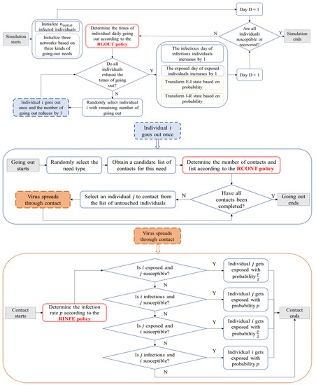 In this paper, the policies for epidemic prevention and control are divided into three types: RGOUT policy, RCONT policy, and RINFE policy. RGOUT policies such as stay-at-home orders and lockdowns mainly limit the times of going out. In the simulation model, the policy is quantified as a parameter named Daily Go Out Times Threshold. Different values of this parameter correspond to different intensities of the RGOUT policy. Many countries and regions (Israel, Germany, China, etc.) instructed not to go out unless absolutely necessary and some have restricted the specific number of times of going out: Colombia (Medellin) limited one member of each family to be able to go out twice a week (on the 2 April 2020); and Uzbekistan, Namangan and Uchqo’rg’on Districts of Namangan Region instruct residents to go out once a day (on the 13 April 2020) [23]. RCONT policies, such as restrictions on mass gatherings, mainly limit the number of contacts while people go out. In the simulation model, the policy is quantified as a parameter named Daily Every Time Contact Threshold. Different values of this parameter correspond to different intensities of the RCONT policy. Many countries and regions have imposed restrictions on the number of people gathered. For example, the Australian Government announced gatherings will be restricted to two persons only (on the 29 March 2020); Georgia banned gatherings of more than three people (on the 31 March 2020); and in Indonesia, the Jakarta provincial government issued a restriction on mass gatherings of up to 5 people (on 10 April 2020) [23]. RINFE policies, such as reducing face touching and wearing masks in crowded or enclosed spaces, mainly standardize people’s personal health protection. In the simulation model, the policy is quantified as a parameter called Infection Rate, which refers the per-contact transmission probability that an infectious individual transmits the virus to a susceptible individual. Different values of this parameter correspond to different intensities of the RINFE policy. The infection rate is between 0.002–0.1 [49].