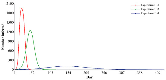 Infection curves of basic experiments based on three kinds of going-out needs. Note: Experiments 1-1 to 1-3 indicate that the three types of policies are all in strict, moderate and loose states, respectively. Specific parameter values are presented in Table 2.