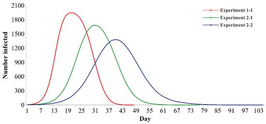 Figure 3 shows the infection curves of the first set of experiments (experiment 1-1 to experiment 1-3). The x-axis represents time (days), and the y-axis indicates the number of infected individuals (E or I). The blue curve represents the experimental scenario when the intensity of the three policies is strict (that is, the parameters controlled by the three policies are at the minimum). The curve is the flattest, with a flatness index of 3.5840, a peak value of 119.42, and an epidemic duration of 428 days. The green curve represents the experimental scenario when the intensity of the three policies is moderate (that is, the parameters controlled by the three policies are intermediate values). The curve is slightly flat, with a flatness index of 0.0945, a peak value of 1259.68, and an epidemic duration of 119 days. The red curve represents the experimental scenario when the intensity of the three policies is loose (that is, the parameters controlled by the three policies are maximized). The curve is very steep, with a flatness index of 0.0247, a peak value of 1944.56, and an epidemic duration of 48 days. Compared with the infection curves when the three policies are at moderate and loose intensity, the infection curve when the three policies are in a strict state can be flattened: the peak values drop by 90.52 and 93.86%, the peak arrival times are delayed by 237.78 and 623.81%, and the epidemic durations are extended by 259.66 and 791.67%, respectively.