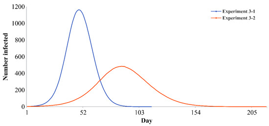 In the third set of experiments (experiment 3-1 to experiment 3-6), policy effectiveness is compared by fixing the intensities of two types of policies in a strict state and varying the intensity of the other policy. When the intensities of the RCONT and RINFE policies are strict and the intensity of the RGOUT policy increases from loose to moderate, the infection curve is flattened (Figure 5): the peak value decreases by 58.22%, the peak arrival time is delayed by 81.25% and the epidemic duration is prolonged by 91.23%. Similarly, when the intensities of the RGOUT and RINFE policies are strict and the intensity of the RCONT policy increases from loose to moderate, the infection curve is flattened (Figure S3): the peak value decreases by 33.28%, the peak arrival time is delayed by 31.67%, and the epidemic duration is prolonged by 35.77%. When the intensities of the RGOUT and RCONT policies are strict and the intensity of the RINFE policy increases from loose to moderate, the infection curve is flattened (Figure S4): the peak value decreases by 34.95%, the peak arrival time is delayed by 32.05%, and the epidemic duration is prolonged by 7.46%.