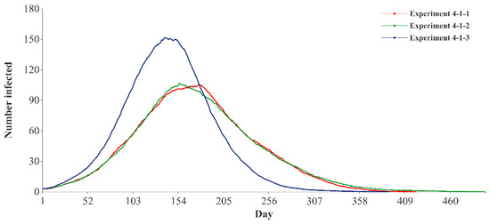 In the fourth set of experiments (experiment 4-1 to experiment 4-3), this paper explores the impact of different going-out needs on the effectiveness of policy prevention and control. The infection curves of different kinds of going-out needs when the intensity of three policies is strict are presented in Figure 6, and the differences between infection curves are significant. Compared with physiological safety needs, the infection curves based on family needs and friendship needs can be flattened: the peak values decrease by 30.70 and 29.70%, while the peak arrival times are delayed by 27.34 and 11.51%, and the epidemic durations are extended by 7.65 and 27.30%. Similar results are found when the intensity of three policies is loose (Figure S5) and moderate (Figure S6).