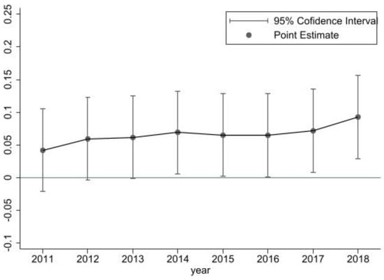 In Figure 1, the vertical axis represents the estimated interaction term between the experimental group and different years, which evaluates the dynamic economic growth effects for each year before and after the BRI, and the horizontal axis represents the number of years before and after the BRI. Moreover, the estimated coefficients of interaction terms are not significant, indicating that the trend of the belt-road countries and non-belt-road countries has no system difference before the BRI (2014), which proves that the DID method is valid and reliable. In and after 2014, the estimated coefficients of the interaction term are significantly positive and become larger, which means that the economic effect of the BRI appears after 2014. Taken together, our main results that the BRI can significantly promote economic growth are robust and reliable.