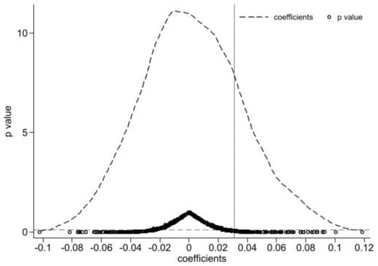Moreover, we referred to the method of Yang et al. to conduct a placebo test by randomly selecting the number of countries in the treatment group from the sample [37] to exclude the effect from the unobservable factors on our baseline results. Specifically, the sample of this paper contains 171 countries, including 61 belt-road countries. Accordingly, 61 countries were randomly selected from the sample of 171 and set as the “false” treatment group, and the remaining 110 countries were considered as the “false” control group to construct a dummy variable and then construct interaction term . Given that the “false” experiment group is randomly generated, the coefficients of interaction terms would not deviate significantly from zero, which indicates that the promotion of economic growth in belt-road countries is caused by the implementation of the BRI, rather than other unobservable variables. Additionally, the above procedure was repeated 500 times to exclude the confusion from the effect of other small probability events on baseline results.