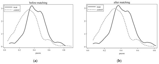 Furthermore, we referred to the method of Sun and Li, to use the PSM-DID method, which integrates the propensity score matching and the DID, to better exclude the effect of sample selection [32] bias on the baseline results. Specifically, based on the kernel matching method, we estimated the propensity score for each belt-road country through a Logit regression model, in which the explained variable was whether the country is a belt-road country and the covariates were the above control variables.