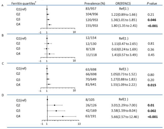Adjusted odds ratio (OR) for dyslipidemia associated with sex-specific quartiles of ferritin among the overall participants and PBF-stratificated participants. (A) The overall participants (n = 3819) (B). Participants with low fat (PBF Z-scores < −1) (n = 530) (C). Participants with healthy fat (−1 ≤ PBF Z-scores ≤ 1 (n = 2686) (D). Participants with overweight and obese (PBF Z-scores > 1) (n = 591). * ORs (95% CIs) were adjusted for age, gender, WHtR, pubertal stage (pre-pubertal, pubertal), sedentary time, and energy intake. † Sex-specific quartiles of ferritin were defined among the overall participants and among participants with low fat, healthy fat, and overweight/obesity, separately. ORs shown in bold font are statistically significant at p < 0.05.