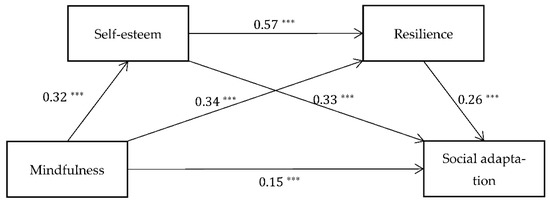 The sequential mediation model between mindfulness and social adaptation through self-esteem and resilience. *** p < 0.001.